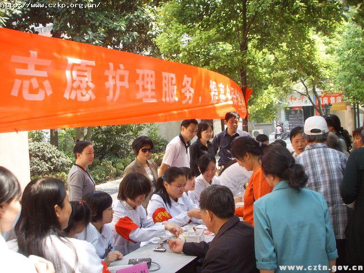 5月12日是国际护士节。这一天阳光灿烂,微风吹拂着天宁斜桥巷小区健身广场上的绿树。树荫下一群年轻漂亮的白衣护士正忙碌着,为社区居民量血压、测血糖,上面一条红色的横幅写着“志愿护理服务,提高全民健康水平——纪念5、12国际护士节”。这是斜桥巷社区妇联、老龄、计生、科协与常州第一人民医院在“国际护士节”98周年之际一起协办的健教护理服务活动。