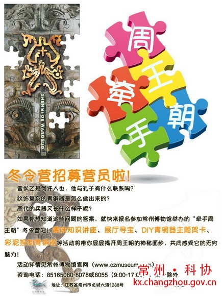 纹饰复杂的青铜器是怎么做出来的? 周代的兵器又是什么样子呢? 如果你想知道这些问题的答案,就快来报名参加常州博物馆举办的“牵手周王朝”冬令营吧!趣味知识讲座、展厅寻宝、DIY青铜器主题贺卡、彩泥捏制青铜器等活动将带你层层揭开周王朝的神秘面纱,共同感受它的无穷魅力! 一、活动时间 2015年2月12日 二、活动地点 常州博物馆 三、活动内容 (一)活动流程 9:00-9:30 签到 9:30-10:00 参观《梦萦周王朝——周代曾国宝藏展》 10:00-10:40 ★《走进神秘的青铜器世界》讲座 10:40-11:30 ★展厅寻宝 11:30-13:00 午餐、午休、观看《国宝档案》——常州篇 13:00-13:40 ★《汉字之美》讲座 13:40-14:40 ★DIY青铜器主题贺卡 14:40-15:40 ★用彩泥捏制青铜器 15:40-16:00 评选出贺卡和彩泥青铜器中的“最美作品” 16:00-16:20 统计积分,颁发证书和奖品 16:20-16:30 问卷调查 16:30-16:40 合影留念 (二)活动规则 本活动采用积分制,在积分项目(打★的为积分项目)中获得的总积分排名前三的营员将获得“优秀营员”称号,并将获得证书和精美奖品;其余获得积分的营员将获得精美奖品。 获取积分规则如下: 1、在《走进神秘的青铜器世界》讲座和《汉字之美》讲座中,若回答对讲师的提问,将获得积分,每答对1题得1分。 2、在展厅寻宝环节,若正确完成寻宝图上的所有题目,并耗时最短的前三名营员将分别获得积分3分、2分和1分。 3、在DIY青铜器主题贺卡和彩泥自制青铜器环节,若作品被评为“最美作品”,其作者将获得积分3分。 四、费用 活动费用全免,午餐自理。 五、报名须知 1、报名时间:即日起至2月8日(截止到2月8日下午17:00)。 2、报名对象:小学3-6年级学生 3、报名人数:按报名先后顺序,取前20位。 4、报名方式:在常州博物馆官网www.czmuseum.com下载报名表(见附件),填写后发至邮箱:kaif@czmuseum.com(以接收时间顺序为准,请注意查看邮箱回复,收到报名成功的回复后请于指定时间、地点参加活动)。不接受电话报名。 5、咨询电话:0519-85165080转8078或8055(9:00—17:00),周一除外。六、注意事项: 1、参与者须填写报名表,报名表中照片一栏请附上一张彩色免冠近照,所填内容必须详细完整、真实可信。 2、活动当天请于指定时间到常州博物馆一楼大厅服务台签到,未成年人可由监护人或临时监护人陪同到场。 3、活动遇暴雨及其他恶劣天气顺延,时间另行通知。 常州博物馆 二〇一五年一月