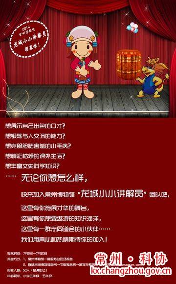 想展示自己出色的口才? 想锻炼与人交流的能力? 想克服胆怯害羞的小毛病? 想精彩枯燥的课外生活? 想丰富文史科学知识? …… 无论你想怎么样,快来加入常州博物馆“龙城小小讲解员”团队吧,这里有你施展才华的舞台,这里有你想要遨游的知识海洋,这里有一群志同道合的小伙伴…… 我们用真心和热情期待你的加入!
