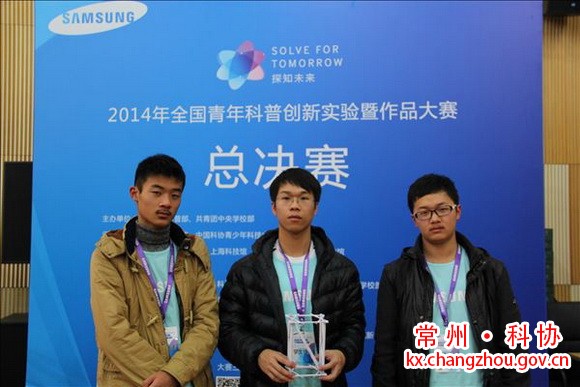 11月20日,“Solve For Tomorrow探知未来 2014年全国青年科普创新实验暨作品大赛”总决赛在北京中国科技馆进行,江苏省前黄中学(常州)由李钰涛、陈征和姚晓辉组成的“前中新园队”参加科普实验--安全保护(高中组)比赛荣获全国第五名,并被授予优胜奖。当天,来自全国各地的58组参赛团队的高手参加现场决赛。各界媒体、上百名现场志愿者、顶尖院校教授评审团、100位“科技梦想”见证者,共同见证了科技创新史上的这一特殊日子。
