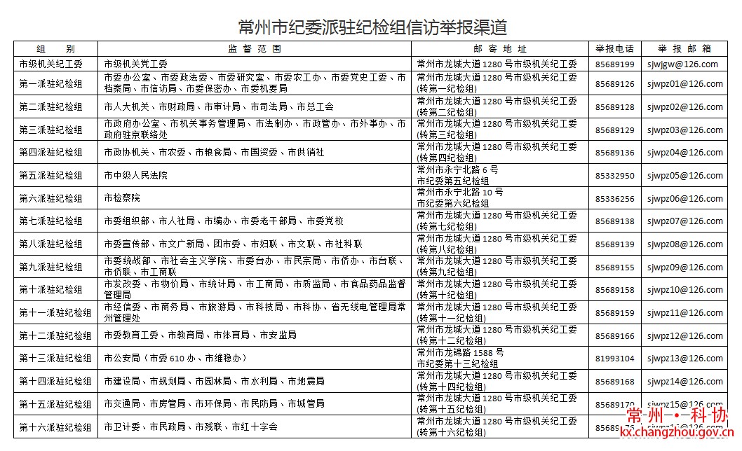 :除第五、第六、第十三派驻纪检组保持原派驻单位地址不变,其他派驻纪检组通信地址统一设为:常州市市级机关纪工委(转第**纪检组),来信由纪工委负责登记转交。对于收到的纸质信访举报件,严格按照《常州市纪委派驻机构信访举报工作暂行办法》处理。