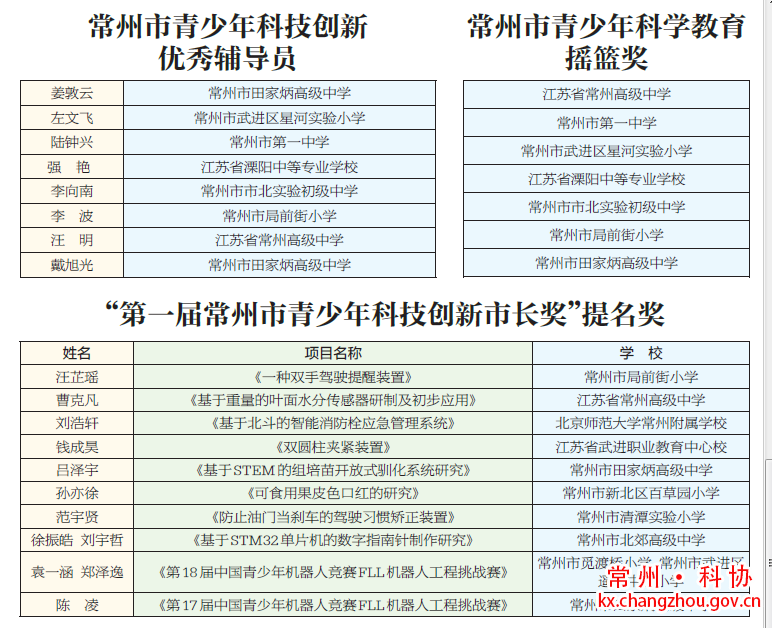 “第一届常州市青少年科技创新市长奖”获奖名单