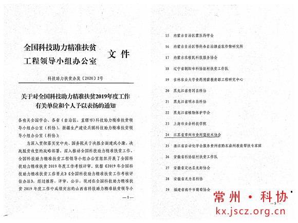 为深入贯彻落实党中央、国务院关于决胜全面建成小康、决战脱贫攻坚的战略部署,深入推动全国科技助力精准扶贫工作,全国科技助力精准扶贫工程领导小组办公室组织开展了全国科技助力精准扶贫2019年度工作考核评审。由常州市农村专业技术协会推荐的市农技协常务理事单位:常州市食用菌技术协会,在全国科技助力精准扶贫工作中,措施有效,成绩突出,被评为“全国科技助力精准扶贫2019年度先进团队”,也是江苏省唯一获奖单位。( 常州市农村专业技术协会秘书处)