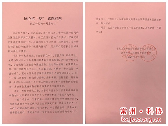疫无情,人有情。4月14日,金坛区西城街道办事处副主任蒋玉新给区科协送来“携手同行抗疫情,不忘初心担使命”锦旗和感谢信,对疫情期间冲锋在前、坚守一线、服务群众的金坛区科协机关和事业单位干部职工的努力和付出,表示衷心的感谢。