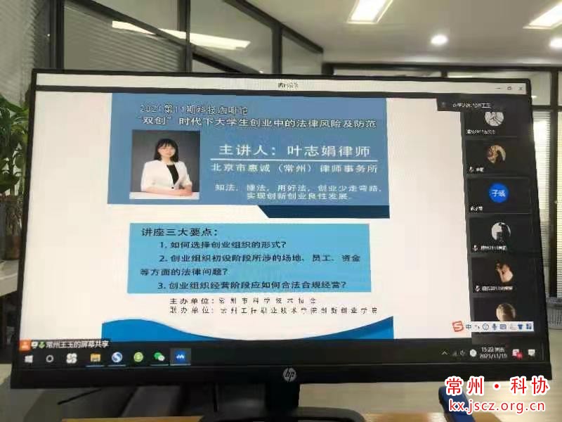 为提高创业者的法律意识,更好的作为一个合法合规的经营者。由鸿发国际主办,常州工程职业技术学院创新创业学院联办今年的第11期科技咖啡馆活动于2021年11月19日下午3点30分利用腾讯会议形式线上开展。本次活动的主题是“双创时代下大学生创业中的法律风险及防范”,邀请到来自北京市惠城律师事务所常州地区驻派律师叶志娟担任主讲。叶律师从如何选择创业组织的形式;创业组织初设阶段所涉的场地、员工、资金等方面的法律问题;创业组织经营阶段应如何合法合规经营三大方面作了详细讲解,为大学生们今年的创业上了一堂很好的法律知识培训课。来自学校大学生创新创业联合会、学校大学生KAB俱乐部、大创园入驻项目负责人和其他校内热爱创新创业的学生和老师共计260余人参加了讲座。活动由青创工程大学生创业园工程创咖实训项目指导老师王玉主持,常州工程职业技术学院创新创业学院仇志海院长最后做总结讲话。(常州鸿发国际 鲁玉凤)