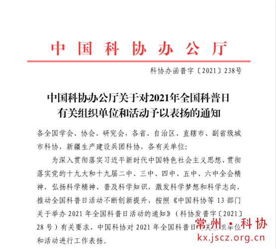 日前,中国科协办公厅下发《关于对2021年全国科普日有关组织单位和活动予以表扬的通知》(科协办函普字〔2021〕238号),武进区湖塘镇科协荣获2021年全国科普日活动优秀组织单位。