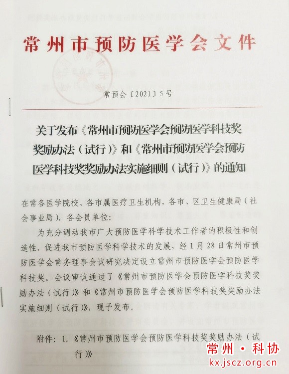2021年2月1日,常州市预防医学会发布了常州市预防医学会预防医学科技奖奖励办法及实施细则,这是我市首个市级学会设立的学科特色鲜明的科技奖项。