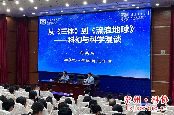 4月30日下午,在江苏省常州高级中学8号楼三楼太雷厅,邀请了南京工业大学机械与动力工程学院、省科普作协科幻专委会主任付昌义老师来常开展“教授进中学”作科幻专题讲座——《从<三体>到<流浪地球>——科幻与科学漫谈》,省常中的师生、校外的科幻写作爱好者及学生家长们近200多人听取了报告。此活动由省常中、省科普作协、市科普创作协会三家联合举办。