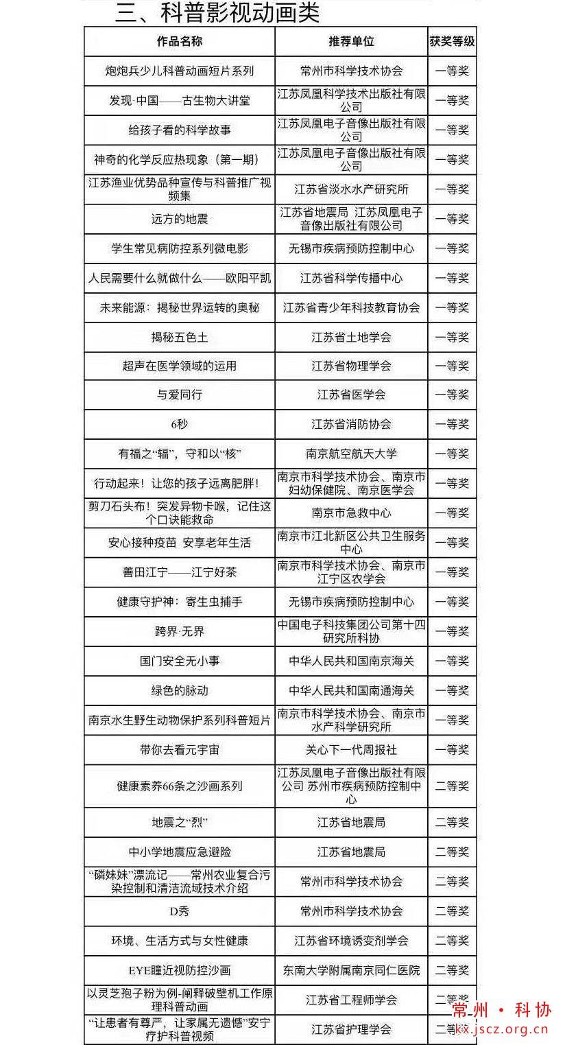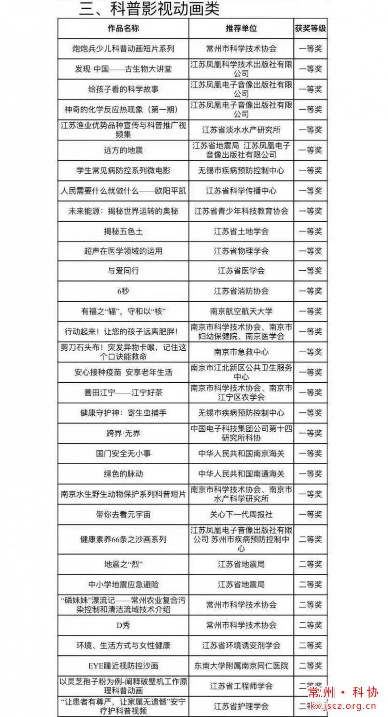 日前,由省科协、省文明办、省科技厅、省广播电视局、省新闻出版局、江苏凤凰出版传媒集团联合主办的第十三届江苏省优秀科普作品评选结果出炉,常州市喜获佳绩,共有11件作品获奖,其中获一等奖作品2件,二等奖作品3件,三等奖作品6件。