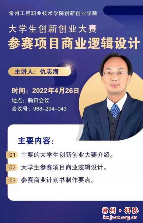 4月26日下午2:00,由鸿发国际联合常州工程职业技术学院通过腾讯会议室共同举办线上第4期科技咖啡馆活动。邀请常州工程职业技术学院创新创业学院院长仇志海老师从大学生创新创业竞赛参赛项目商业逻辑设计入手,讲解如何制作参赛的商业计划书,为参赛选手排忧解难。