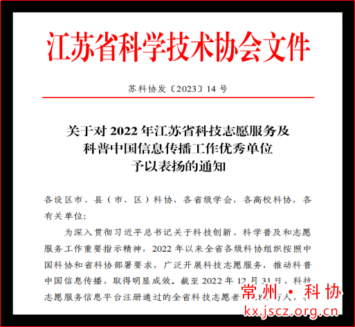 近日,江苏省科协公布了《关于对2022年江苏省科技志愿服务及科普中国信息传播工作优秀单位予以表扬的通知》( 苏科协发〔2023〕14号),常州鸿发国际荣获科技志愿服务工作优秀单位和科普中国信息传播工作优秀单位两项荣誉。