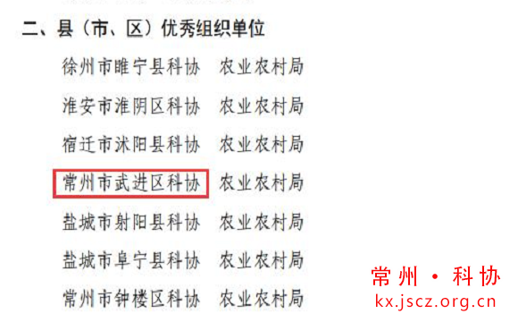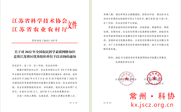近日,江苏省科协、江苏省农业农村厅联合发布《关于对2022年全国农民科学素质网络知识竞赛江苏赛区优秀组织单位予以表扬的通知》(苏科协发〔2023〕107号),武进区科协被评为“2022年全国农民科学素质网络知识竞赛江苏赛区优秀组织单位”。