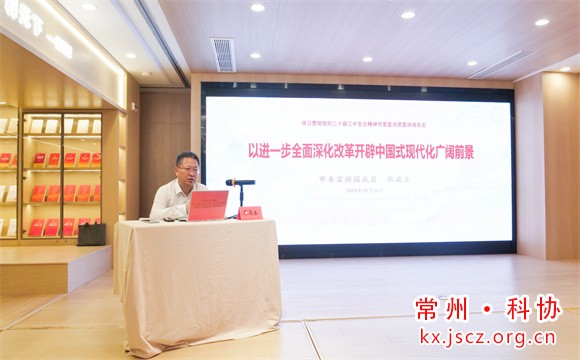 会上,熊焱生从中国共产党历史上的三中全会谈起,从深入学习领会习近平总书记在党的二十届三中全会上的重要讲话精神,进一步全面深化改革的坚实基础、基本遵循、行动纲领等方面,紧扣科技创新和常州实际,对全会精神进行了系统宣讲和深入阐释。他指出,党的二十届三中全会是在以中国式现代化全面推进强国建设、民族复兴伟业的关键时期召开的一次十分重要的会议,审议通过的《中共中央关于进一步全面深化改革、推进中国式现代化的决定》谋的是强国复兴伟业,布的是推进中国式现代化大局,立的是党长期执政、国家长治久安之基,是新时代新征程上推动全面深化改革向广度和深度进军的总动员、总部署,彰显了以习近平同志为核心的党中央将改革进行到底的坚强决心和强烈使命担当。