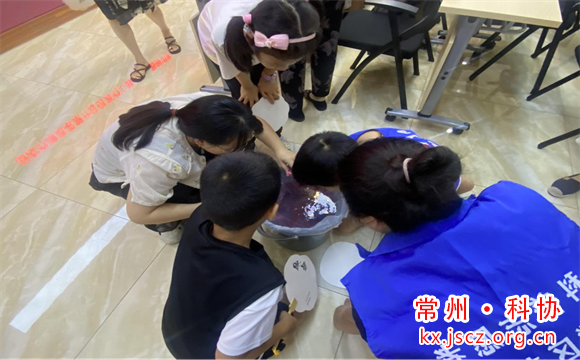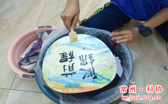 活动开始,科普志愿者为在场人员讲解非遗漆扇的历史渊源、制作流程和艺术特点,使大家对漆扇:这个传统工艺品有了一个初步的了解。同时,第一次知道了原材料大漆,源自中国,纯天然无污染。紧接着,科普志愿者特别强调了“漂漆”是这一技艺的精髓。随后,她带领着跃跃欲试的同学们将不同的颜料倒入清水中,轻微搅拌,用毛笔小心挑动,水面立刻形成流动的花纹,再将白色扇面调整好角度,转动着扇子放入水中,经过漂漆团扇便制作完成。同学们兴趣盎然,迫不及待地发挥自己的想象力和创造力,漆彩调色、团扇入水,一会儿就把一把把平淡无奇的白色扇子变成了富有东方神韵的漂漆扇。“意想不到的好看!”“好神奇啊,每个作品都不一样----”,精美的漆扇制作让小朋友们发出一阵阵惊叹。