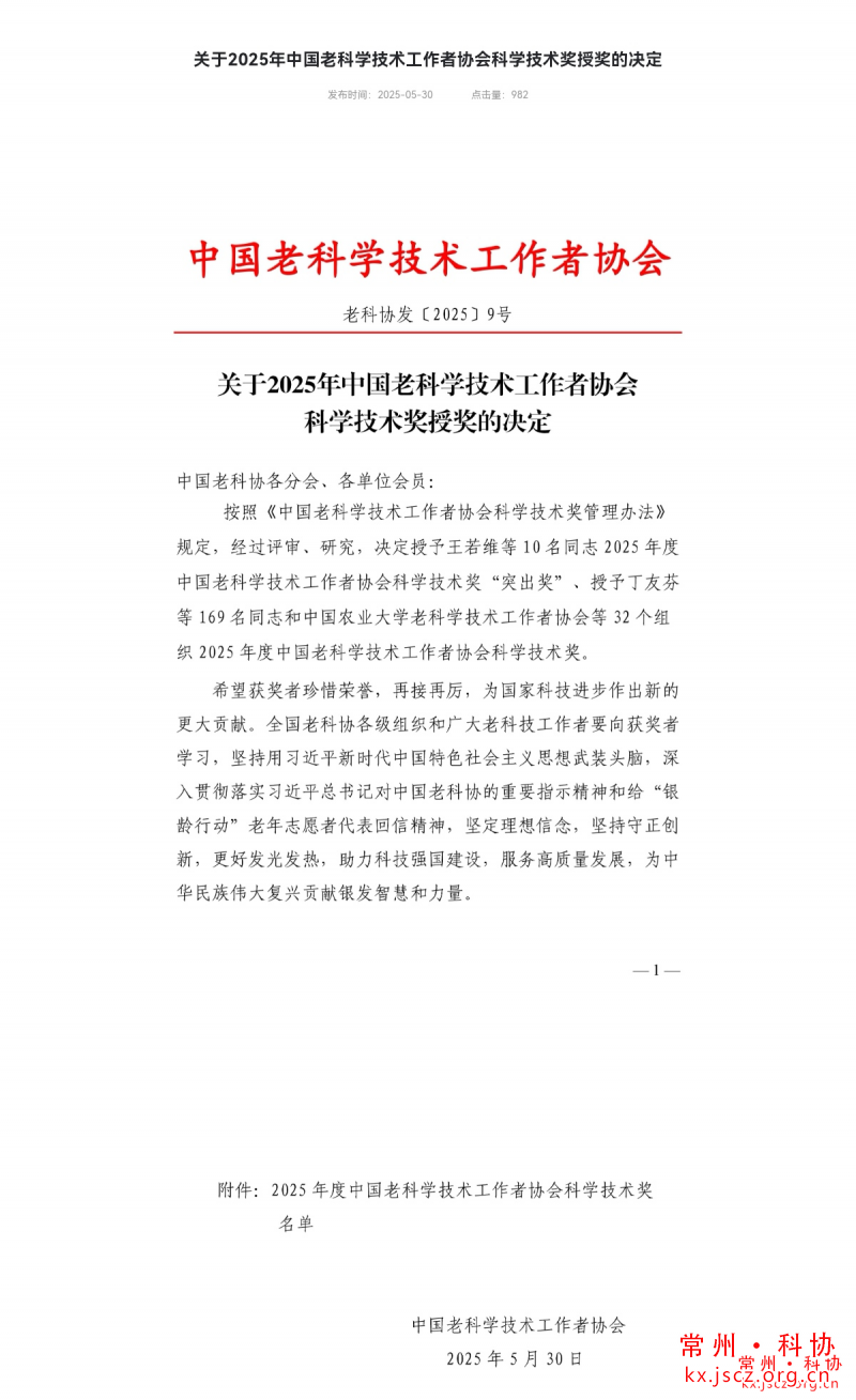 5月30日,正值全国科技工作者日之际,常州市老科技工作者协会凭借在科技创新、科学普及、助企发展、乡村振兴及社会服务等领域的突出贡献,成功斩获“2025年中国老科协先进集体”称号。这一荣誉既是对常州市老科协过去一年工作的权威肯定,更激励着全市老科技工作者在新征程中持续发挥余热,为常州经济科技社会高质量发展注入“银发智慧”。