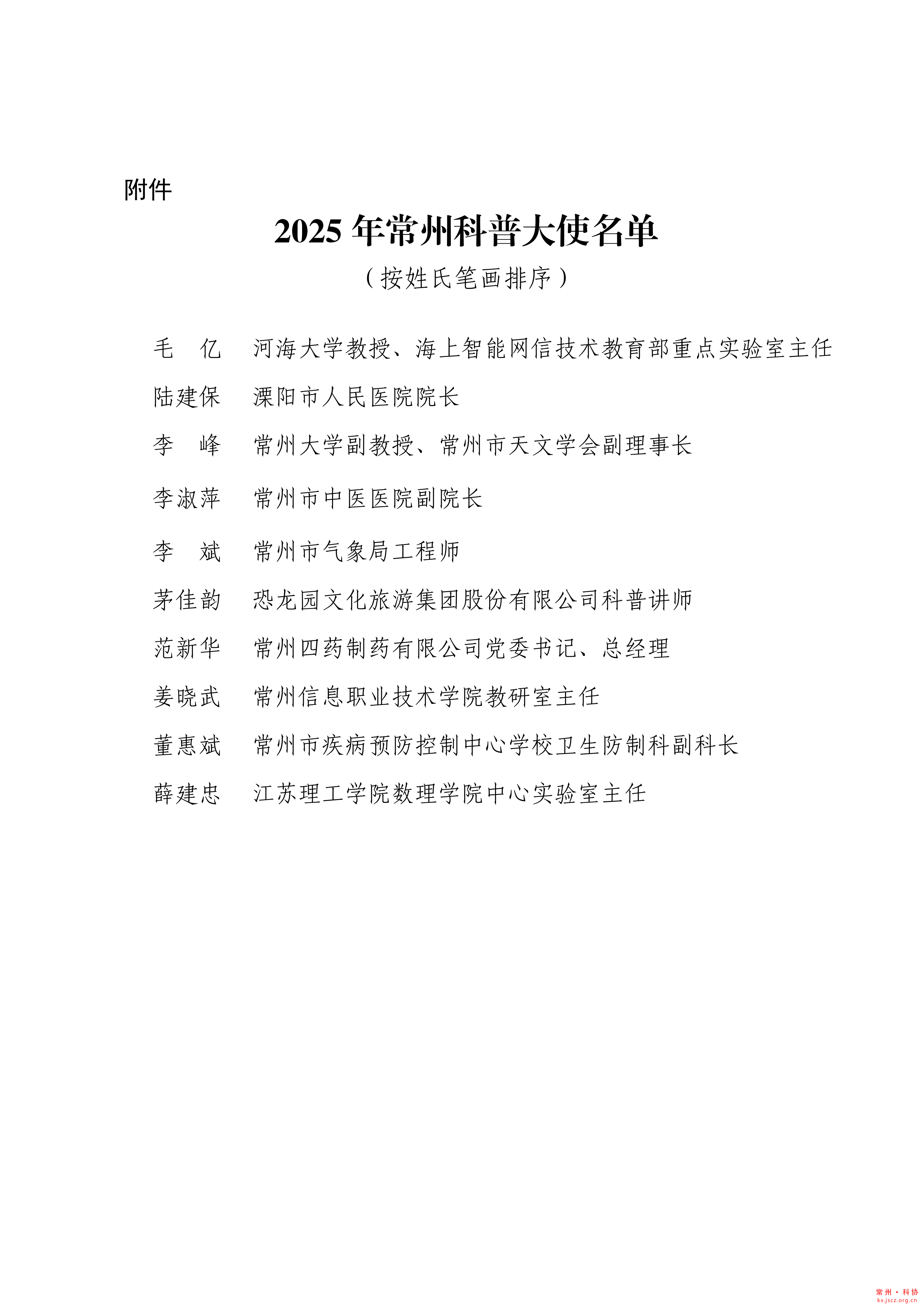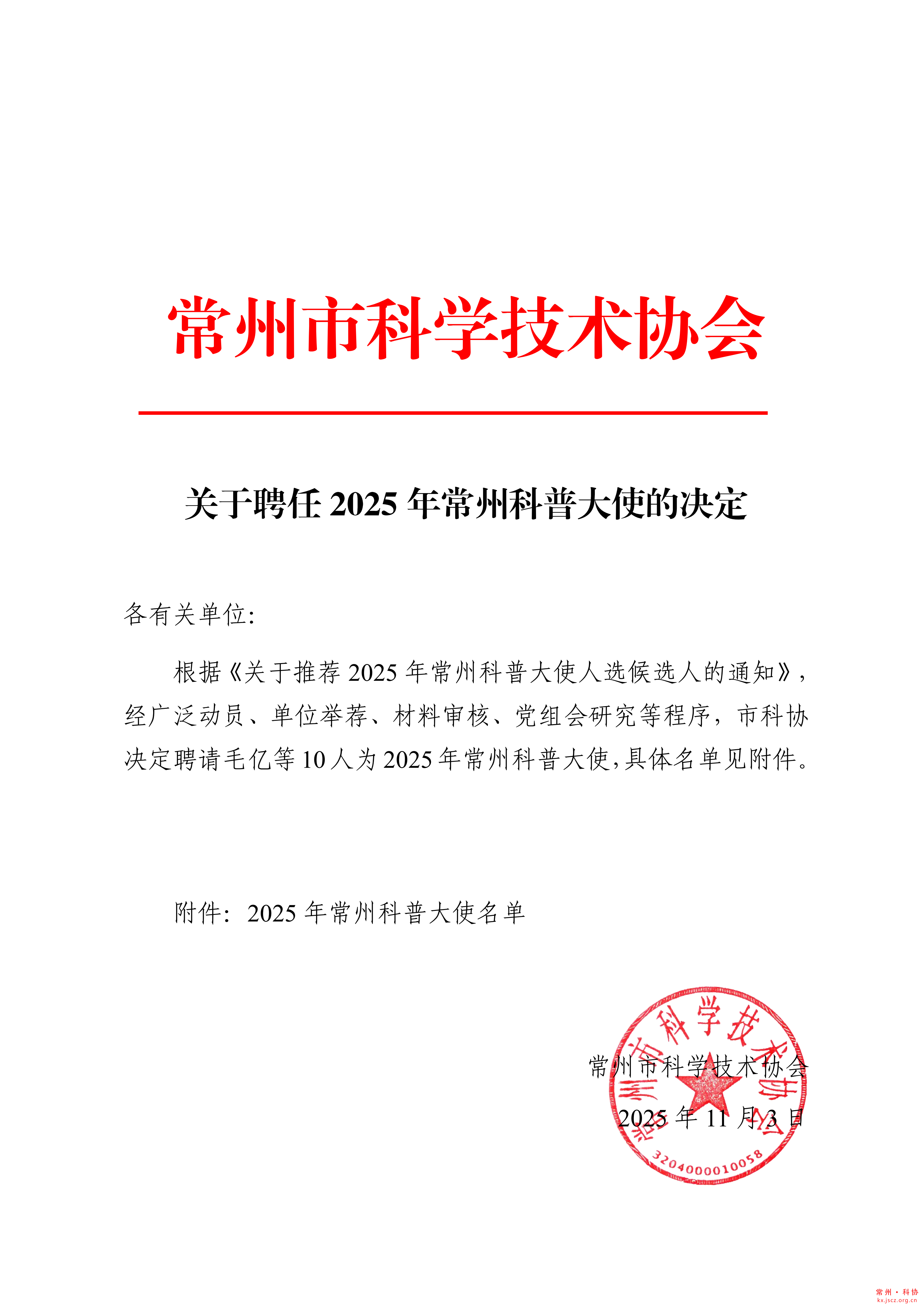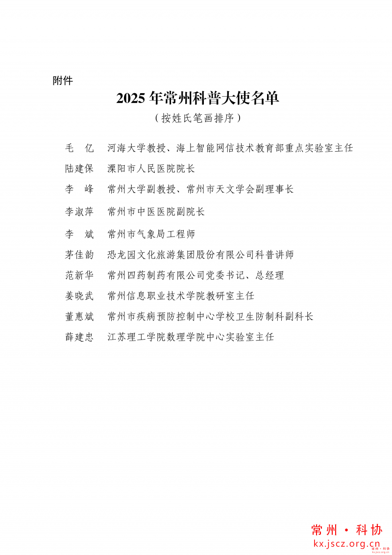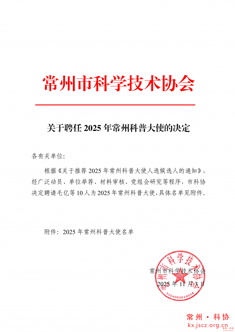 关于聘任2025年常州科普大使的决定
