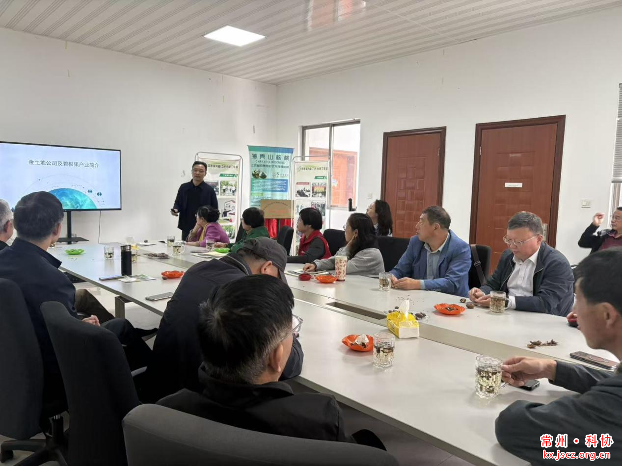 活动首站来到位于新北区的常州市金土地碧根果种植基地。在基地负责人陪同下,老科技工作者们观看了公司的宣传片,聆听了公司负责人巢旸关于碧根果树本土化种植技术及其营养价值的科普介绍。这家企业从2005年就开始以薄壳山核桃的本土化栽培技术研究为重点,从事育苗、种植、推广及技术服务,通过20年的深耕,公司推广种植及技术服务范围遍及全国13个省市。大家实地查看后纷纷感慨:碧根果富含不饱和脂肪酸和抗氧化物质,兼具经济价值与生态效益,是推动“林果经济”绿色发展的优选产业。