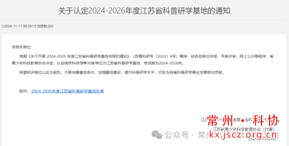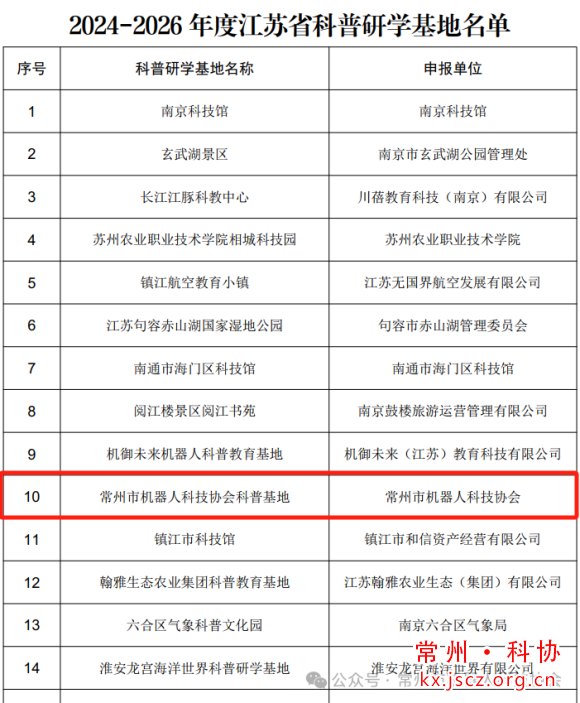 近日,江苏省青少年科技教育协会公布了2024-2026年度江苏省科普研学基地名单,常州市机器人科技协会成功获批省级科普研学基地。